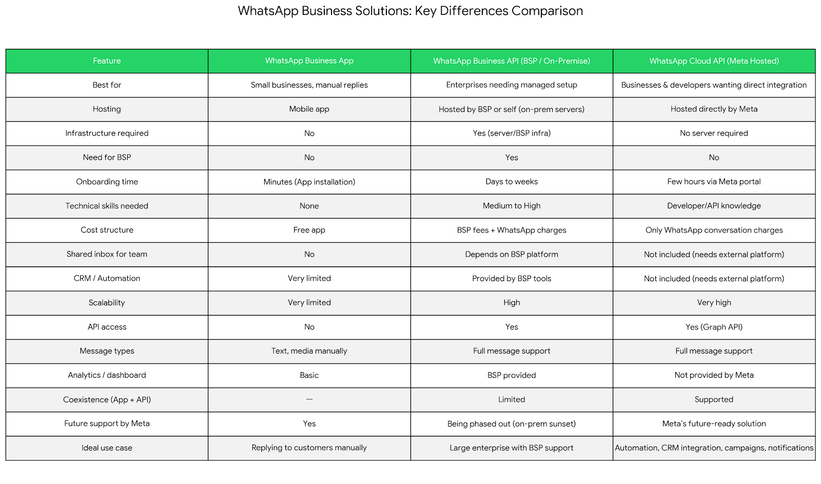| Hosting | Mobile app | Hosted by BSP or self (on-prem servers) | Hosted directly by Meta |